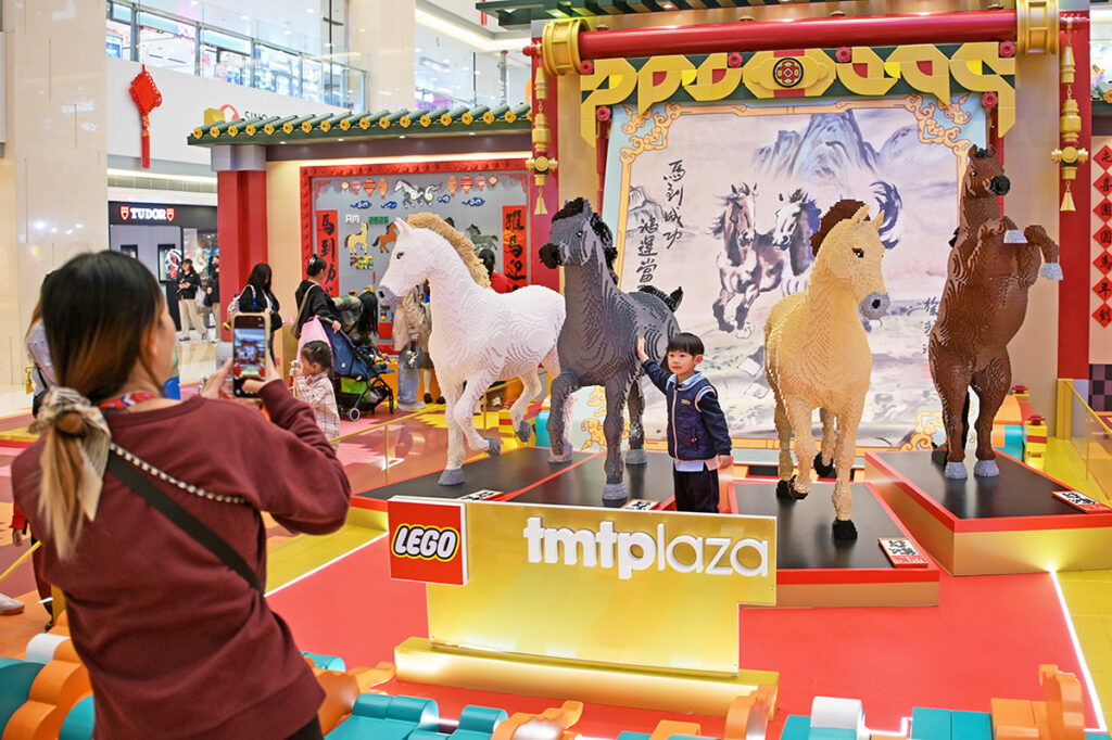 In Hong Kong, a major shopping centre has created the New Year’s Steed Art Park, inspired by Xu Beihong’s horse paintings and built from 400,000 LEGO bricks. Four horses, each standing two metres tall, are displayed alongside two ink-style horses on a backdrop, recreating Six Galloping Horses (六骏图).